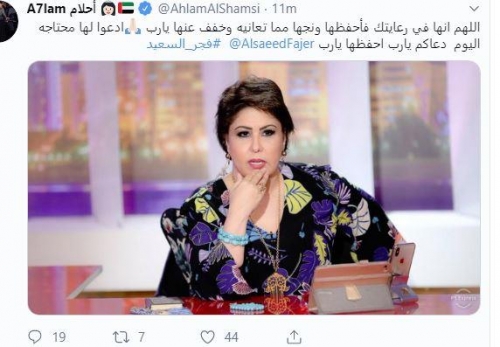 ونشرت أحلام صورا لـ"فجر" عبر صفحتها الشخصية بـ"تويتر" وعلقت: "اللهم إنها في رعايتك فاحفظها ونجّها مما تعانيه، وخفف عنها يا رب ادعوا لها محتاجة اليوم دعاكم يا رب احفظها يا رب".