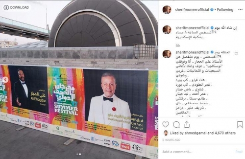 نشر الفنان شريف منير، عبر حسابه على "إنستجرام" بوسترات حفله الأول بمكتبة الإسكندرية، والمقرر إقامته خلال الشهر الجاري.