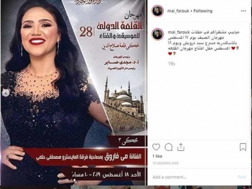 ونشرت مي بوسترات حفلاتها، عبر حسابها الرسمي بموقع "إنستجرام"، وعلقت: " حبايبي منتظراكم في حفلات مهرجان الصيف يوم 17 أغسطس بالإسكندرية، مسرح سيد درويش، ويوم 18 في حفل افتتاح مهرجان القلعة".