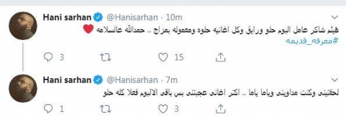 وعلق عبر حسابه الرسمي على"تويتر": "هيثم شاكر عامل ألبوم حلو ورايق، وكل أغانيه حلوة ومعمولة بمزاج، حمدالله عالسلامة".
