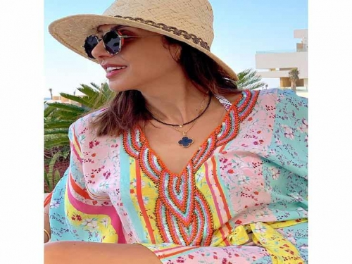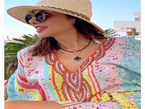 وظهرت أنغام في الصورة بإطلالة صيفية، وارتدت " كاش مايوه" ملون، كما وضعت قبعة على رأسها، وارتدت نظارة شمسية.
