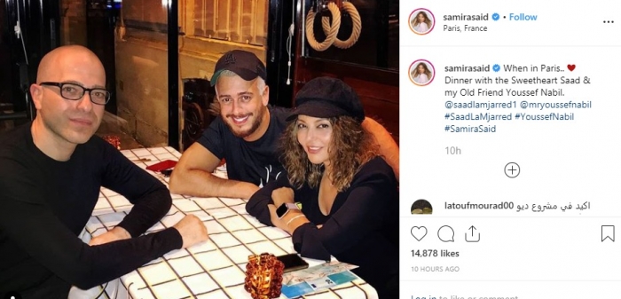 وعلقت: "العشاء مع أصدقائي الغاليين في باريس، المطرب سعد لمجرد، وصديقي القديم يوسف نبيل".