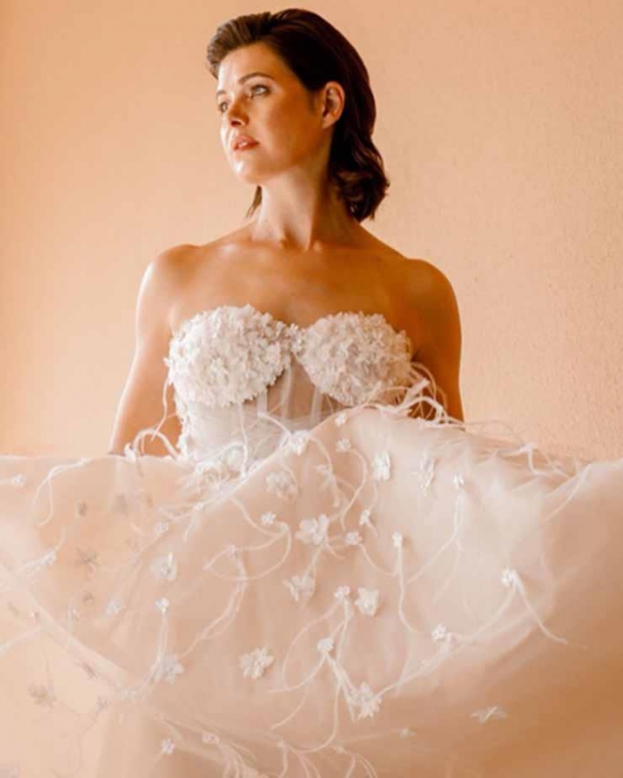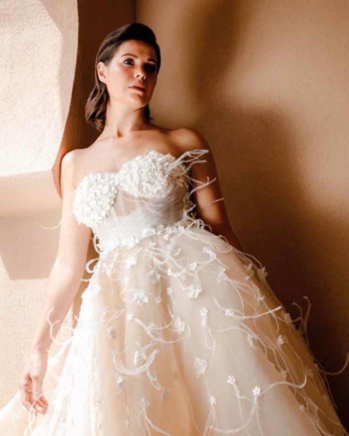 وظهرت يسرا اللوزي بفستان زفاف أبيض طويل بدون أكمام، واتسم التصميم بنقوشات الورد البارزة.