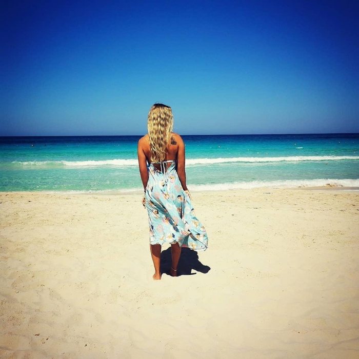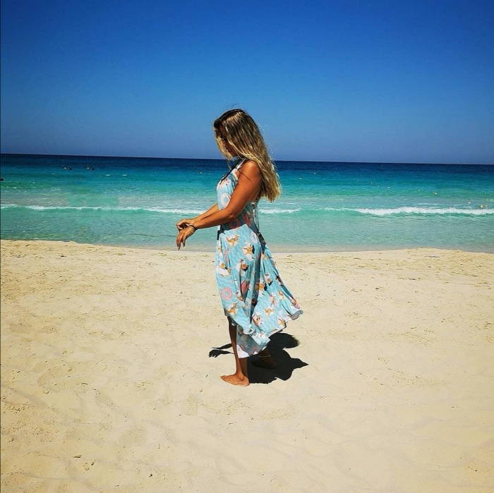 وظهرت ريم في الصور وهي ترتدي فستانًا صيفيًا أمام البحر.