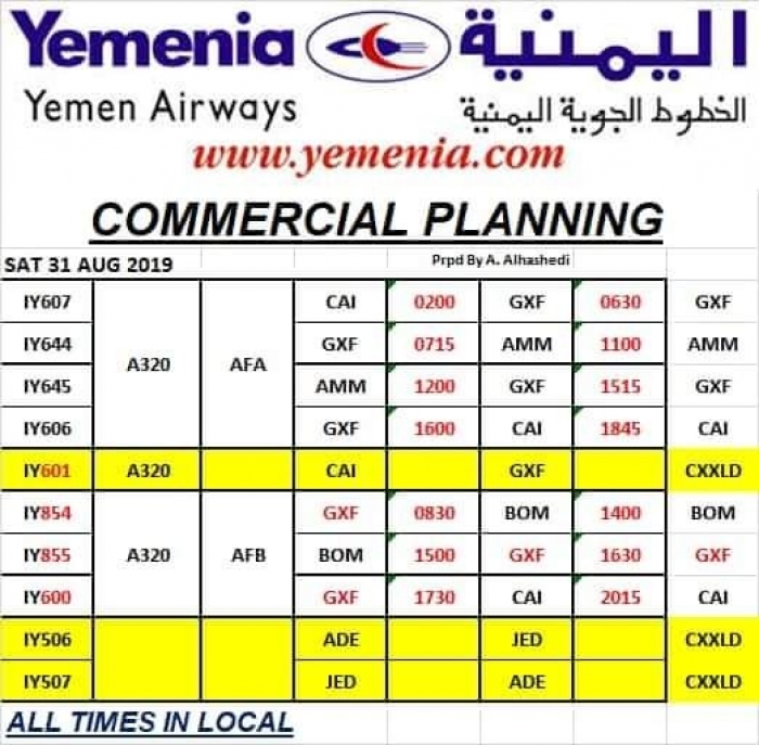 ينشر "المشهد العربي" مواعيد إقلاع رحلات طيران اليمنية غداً السبت الموافق 31 أغسطس 2019.