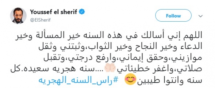 وكتب الشريف في تغريدته: "اللهم إني أسالك في هذه السنة خير المسألة وخير الدعاء وخير النجاح وخير الثواب، وثبتني وثقل موازيني، وحقق إيماني، وأرفع درجتي، وتقبل صلاتي، وأغفر خطيئتي.. سنة هجرية سعيدة.كل سنة وانتوا طيبين".