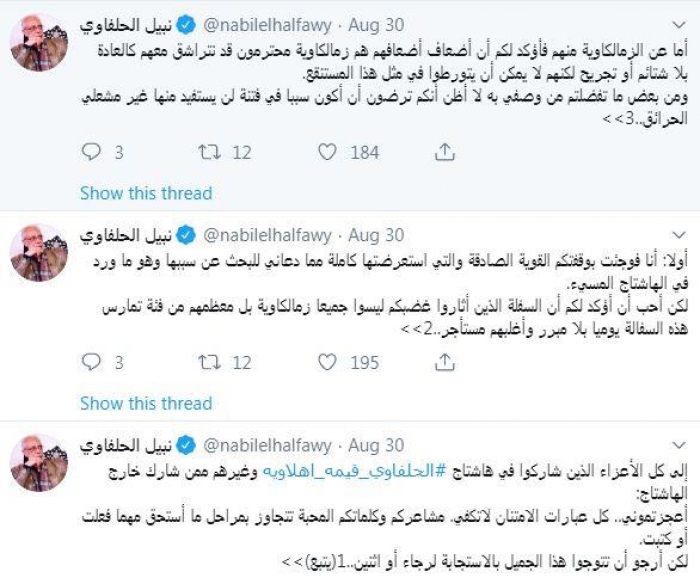 وكتب الحلفاوي، عبر حسابه: "إلى كل الأعزاء الذين شاركوا في هاشتاج #الحلفاوي_قيمه_اهلاوية وغيرهم ممن شارك خارج الهاشتاج، أعجزتموني.. كل عبارات الامتنان لاتكفي.. مشاعركم وكلماتكم المحبة تتجاوز بمراحل ما أستحق مهما فعلت أو كتبت، لكن أرجو أن تتوجوا هذا الجميل بالاستجابة لرجاء أو اثنين".