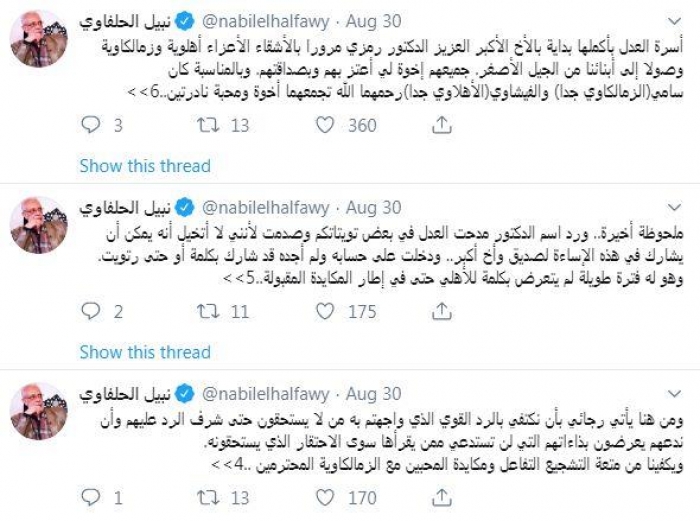 واستطرد: "ملحوظة أخيرة.. ورد اسم الدكتور مدحت العدل في بعض تويتاتكم وصدمت لأنني لا أتخيل أنه يمكن أن يشارك في هذه الإساءة لصديق وأخ أكبر.. ودخلت على حسابه ولم أجده قد شارك بكلمة أو حتى رتويت. وهو له فترة طويلة لم يتعرض بكلمة للأهلي حتى في إطار المكايدة المقبولة".