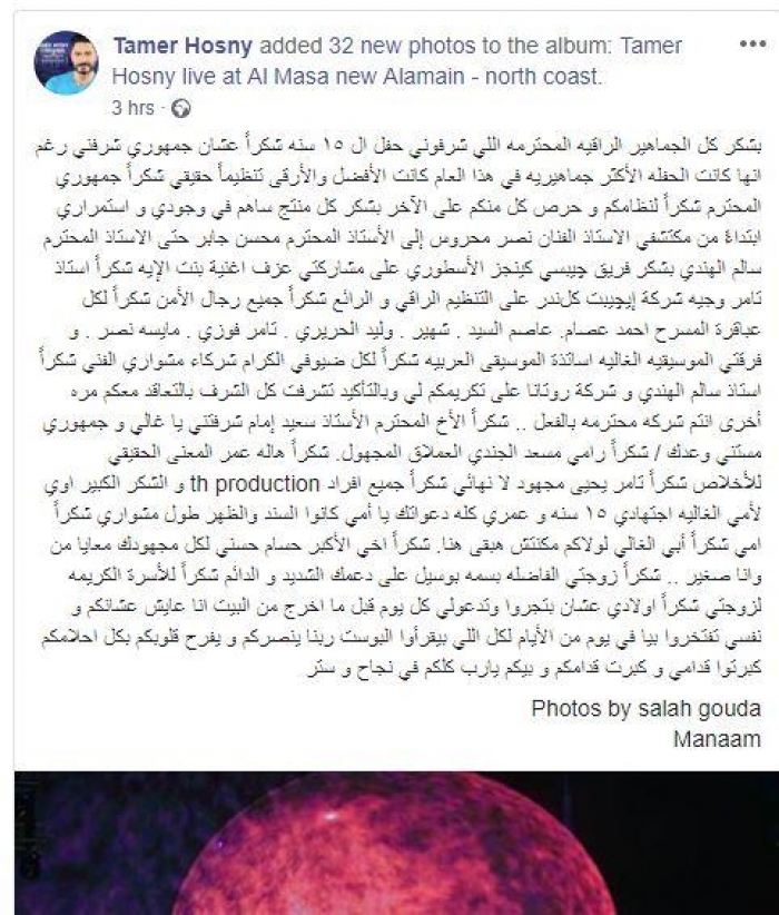 ونشر تامر صورًا من الحفل، عبر صفحته الشخصية بموقع "فيسبوك"، معلقًا: "بشكر كل الجماهير الراقية المحترمة اللي شرفوني حفل الـ ١٥ سنة، شكراً عشان جمهوري شرفني رغم انها كانت الحفلة الأكثر جماهيرية في هذا العام كانت الأفضل والأرقى تنظيماً حقيقي شكراً جمهوري المحترم شكراً لنظامكم وحرص كل منكم على الآخر".