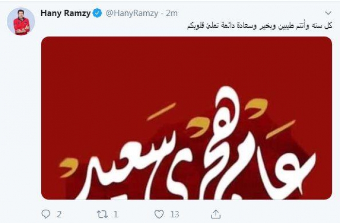 وكتب الفنان هاني رمزي، عبر حسابه على"تويتر": "كل سنة وأنتم طيبين وبخير وسعادة دائمة تملأ قلوبكم".