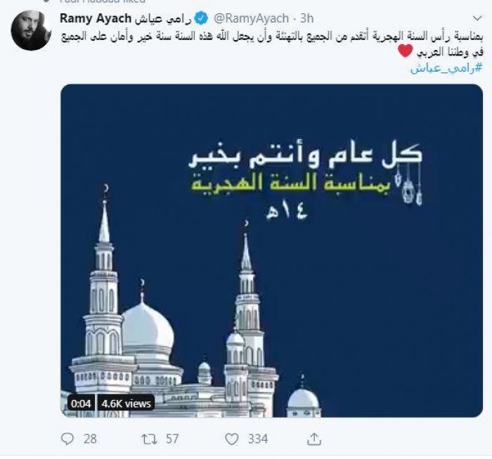 وقال المطرب رامي عياش، عبر حسابه على"تويتر": "بمناسبة رأس السنة الهجرية، أتقدم للجميع بالتهنئة، وأن يجعل الله هذه السنة، سنة خير وأمان على الجميع في وطننا العربي".