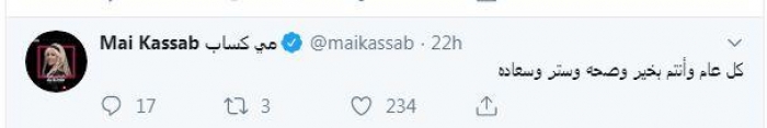وعلقت الفنانة مي كساب عبر حسابها على"تويتر": "كل عام وأنتم بخير وصحة وستر وسعادة".