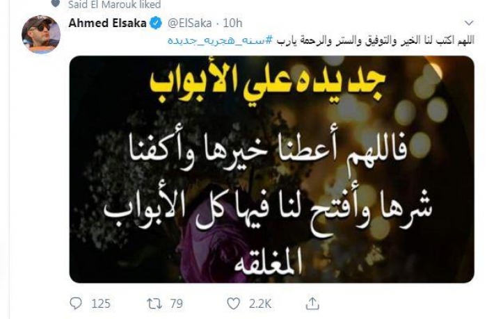 النجم أحمد السقا، الذي كتب عبر "تويتر": "اللهم أكتب لنا الخير والتوفيق والستر والرحمة، يارب سنة هجرية جديدة".