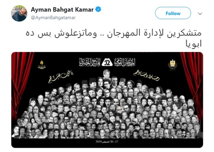 وجه الشاعر الغنائي والسيناريست أيمن بهجت قمر الشكر لإدارة المهرجان القومي للمسرح بمصر، بعد تعديل الأفيش الرسمي للدورة الثانية عشرة والتي اختتمت فعالياتها الجمعة، وإضافة صورة والده الكاتب المسرحي بهجت قمر.