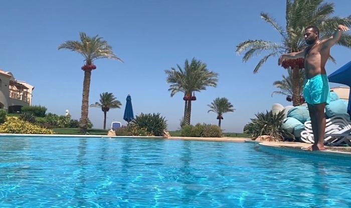 وظهر تامر بملابس البحر، داخل حمام السماحة.