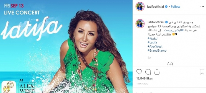 ونشرت لطيفة صورة لها عبر حسابها على "انستجرام" وعلقت: "جمهوري الغالي في الإسكندرية، استنوني يوم الجمعة 13 سبتمبر في مدينة أليكس، إن شاء الله هنقضي ليلة جميلة".
