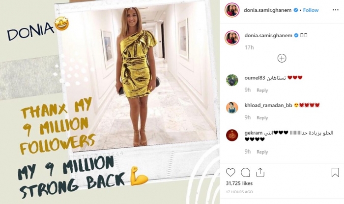 احتفلت الفنانة المصرية دنيا سمير غانم بوصولها لـ 9 مليون متابع، معربة عن سعادتها بوصول عدد متابعيها إلى 9 ملايين، عبر صفحتها الشخصية بموقع "إنستجرام".