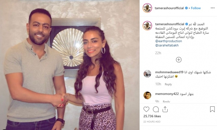 نشر المطرب المصري تامر عاشور، عبر حسابه الشخصي بموقع "إنستجرام" صورة تجمعه بالمنتجة سارة الطباخ.