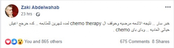 نشر الفنان المصري زكي فطين عبدالوهاب، عبر حسابه الشخصي بموقع "فيسبوك" منشور يعبر به عن سعادته البالغة، بعد ظهور نتائج التحاليل الذي أجراها قبل يومين، بشأن تطورات إصابته بالسرطان، مُعلنًا توقفه عن العلاج الكيماوي لمدة شهرين.