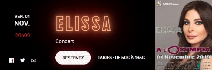 تحيي النجمة اللبنانية إليسا حفلا غنائيا ضخما على مسرح أوليمبيا هول "Olympia hall" فى باريس بفرنسا مطلع شهر نوفمبر وسط عدد كبير من محبيها ومعجبيها، و من المقرر أن يبدء الحفل في الثامنة مساء ويستمر لمدة ساعتين.