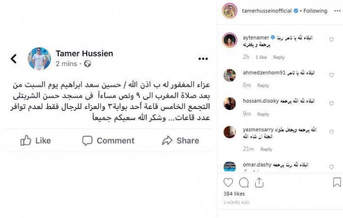 وكتب تامر: "عزاء المغفور له بإذن الله (حسين سعد إبراهيم يوم السبت من بعد صلاة المغرب إلى ٩ ونص مساءاً فى مسجد حسن الشربتلى التجمع الخامس قاعة أُحد بوابة ٣ والعزاء للرجال فقط لعدم توافر عدد قاعات، وشكر الله سعيكم جميعاً).