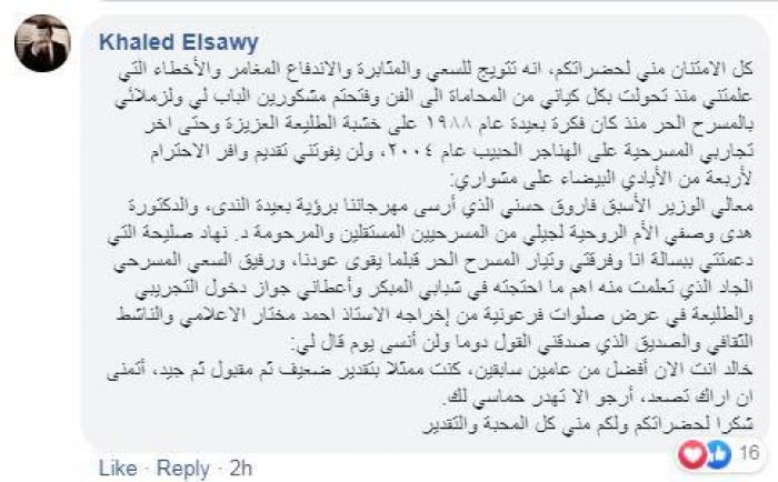 وأضاف الصاوي: لن يفوتني تقديم وافر الاحترام لأربعة من الأيادي البيضاء على مشواري: وزير الثقافة الأسبق فاروق حسني الذي أرسى مهرجانا برؤية بعيدة المدى، والدكتورة هدى وصفي الأم الروحية لجيلي من المسرحيين المستقلين والراحلة د. نهاد صليحة التي دعمتني ببسالة وفرقتي وتيار المسرح الحر قبل أن يقوى عودنا، ورفيق السعي المسرحي الجاد الذي تعلمت منه في شبابي المبكر وأعطاني جواز دخول التجريبي والطليعة في عرض "صلوات فرعونية" أحمد مختار الإعلامي والناشط الثقافي والصديق الذي صدقني القول دوما ولن أنسى يوم قال لي: "خالد أنت الآن أفضل من عامين سابقين، كنت ممثلا بتقدير ضعيف ثم مقبول ثم جيد، أتمنى أن أراك تصعد، أرجو إلا تهدر حماسي لك".