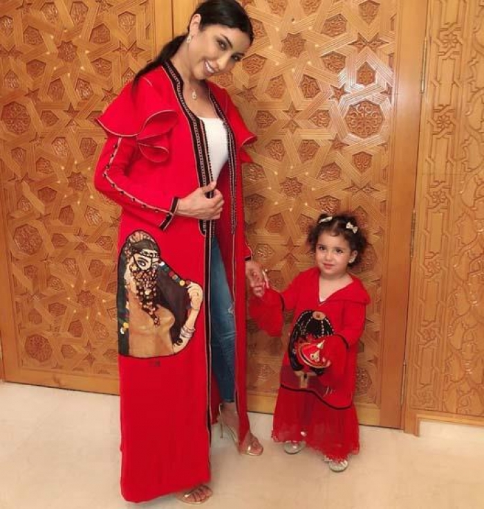 وظهرت "دنيا" وابنتها في الصور بنفس الإطلالة بعباءة حمراء، وقد رسمت دنيا على عبائتها صورة لها من كليبها الأخير "الزمن بيدور".