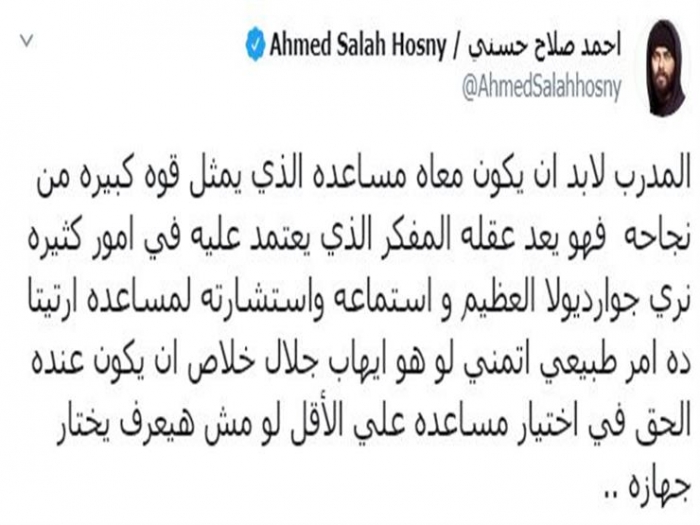 وكتب حسني: "المدرب لا بد أن يكون معاه مساعده الذي يمثل قوة كبيرة من نجاحه، فهو يعد عقله المفكر الذي يعتمد عليه في أمور كثيرة، نرى جوارديولا العظيم واستماعه واستشارته لمساعده أرتيتا، دا أمر طبيعي، أتمنى لو هو إيهاب جلال خلاص، أن يكون عنده الحق في اختيار مساعده، على الأقل لو مش هيعرف يختار جهازه".