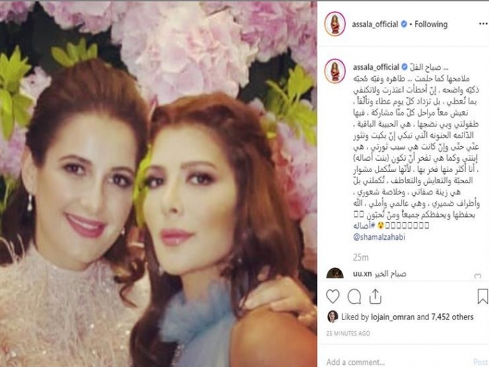 شاركت المطربة السورية أصالة نصري جمهورها بصورة تجمعها بابنتها شام الذهبي، معربة عن حبها لها وذلك عبر صفحتها الشخصية بموقع "إنستجرام".