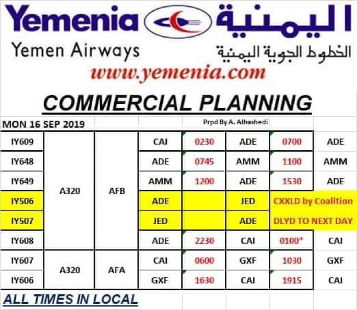 مواعيد رحلات طيران اليمنية غداً الإثنين 16 سبتمبر 2019