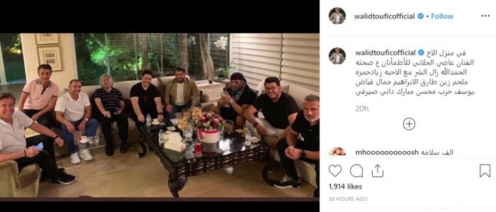 وظهر في الصورة كل من الفنان عاصي الحلاني، والفنان ملحم زين، وعلق وليد توفيق على الصورة: " في منزل الأخ الفنان عاصي الحلاني، للأطمئنان على صحته، الحمدلله زال الشر مع الأحبة زياد حمزة، ملحم زين، طارق الإبراهيم، جمال فياض، يوسف حرب، محسن مبارك، داني صيرفي".