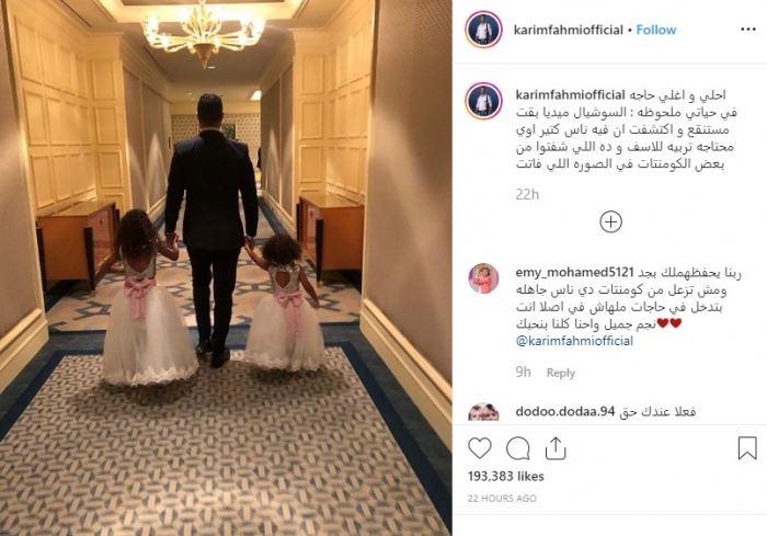 وكتب كريم فهمي في تعليقه على الصورة: "أحلى وأغلى حاجه في حياتي، ملحوظة: السوشيال ميديا بقت مستنقع واكتشفت إن فيه ناس كتير قوي محتاجة تربية للأسف، وده اللي شفتوا من بعض الكومنتات في الصورة اللي فاتت".