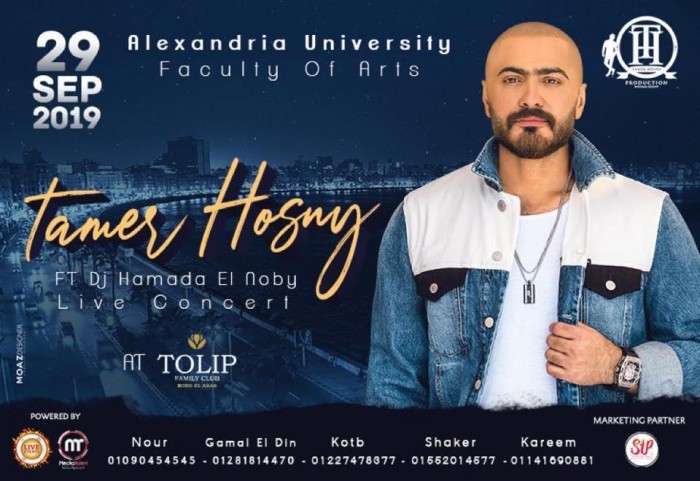 ونشر تامر بوستر دعائي للحفل، عبر حسابه الرسمي بموقع " فيسبوك"، وعلق: "تامر حسني في حفل تخرج طلاب كلية الآداب جامعة الإسكندرية دفعة 2019، يوم 29 سبتمبر 2019".
