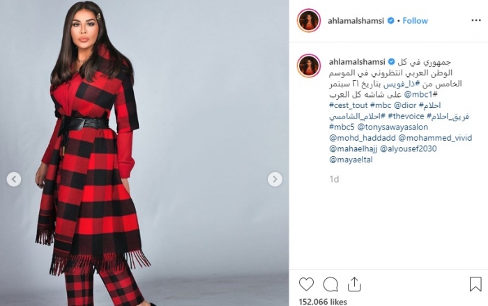 وظهرت أحلام في الصور بإطلالة كلاسيكية، وارتدت ملابس من الكروهات من اللونين الأحمر والأسود، وعلقت على الصور: " جمهوري في كل الوطن العربي، انتظروني في الموسم الخامس من ذا فويس، بتاريخ 21 سبتمبر على شاشة كل العرب mbc".