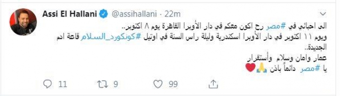 وكتب الحلاني، عبر حسابه على"تويتر" : "إلى أحبائي في مصر، رح أكون معكم في دار الأوبرا بالقاهرة يوم ٨ أكتوبر.. ويوم ١١ أكتوبر في دار الأوبرا اسكندرية.. وليلة رأس السنة في أوتيل كونكورد السلام قاعة أدم الجديدة، عمار وآمان وسلام واستقرار يا مصر دائماً باذن الله".