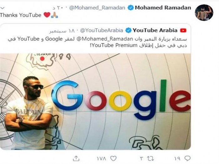 نشر الحساب الرسمي لموقع "يوتيوب" شكرًا للفنان المصري محمد رمضان، ونشر الحساب صورة رمضان من داخل شركة يوتيوب في دبي.