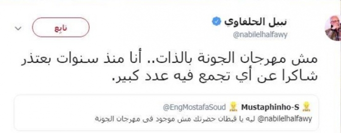 ورد الحلفاوي على سؤال أحد متابعيه عن عدم حضوره مهرجان الجونة ،"ليه يا قبطان حضرتك مش موجود فى مهرجان الجونة؟".