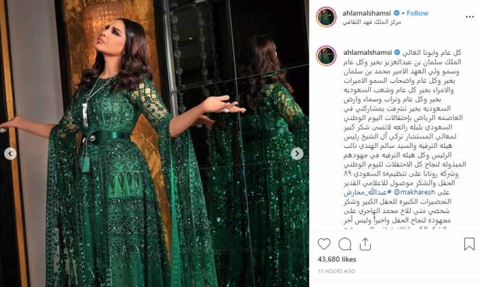 وتابعت: "كل عام وشعب السعودية بخير، وكل عام وتراب وسماء وأرض السعودية بخير، تشرفت بمشاركتي في العاصمة الرياض بإحتفالات اليوم الوطني السعودي، بليله رائعه لا تنسى".