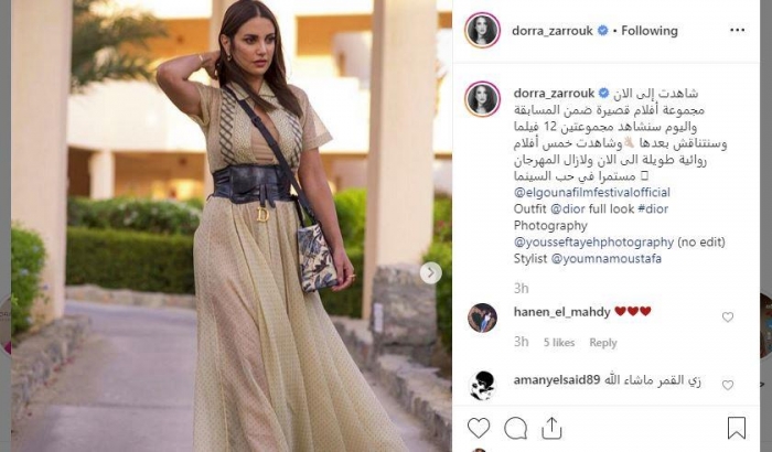 نشرت الفنانة التونسية درة، صورًا جديدة لها في سادس أيام مهرجان الجونة السينمائي، وذلك عبر صفحتها الشخصية بموقع "إنستجرام".