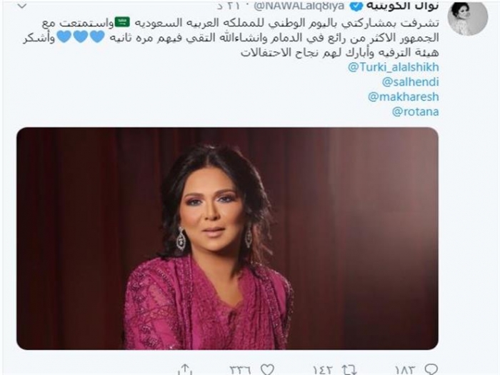 وكتبت نوال الكويتية: "تشرفت بمشاركتي في اليوم الوطني للمملكة العربية السعودية، واستمتعت مع الجمهور الأكثر من رائع في الدمام، وإن شاء الله التقي فيهم مرة ثانية، وأشكر هيئة الترفيه وأبارك لهم نجاح الاحتفالات".