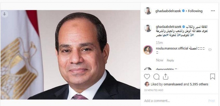 نشرت الفنانة غادة عبد الرازق، صورة الرئيس المصري عبد الفتاح السيسي، معربة عن دعمها لمصر والشعب والجيش والشرطة.