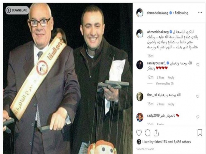 ونشر السقا، صورته مع والده، عبر حسابه على"إنستجرام" وعلق قائلا: "الذكرى التاسعة لوالدي صلاح السقا، رحمة الله عليه، ولكنك معي دائمًا بنصائح ومبادئ وأصول تعلمتها علي يديك، اللهم اغفر له وارحمه".