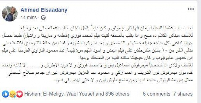 وعلق: "أحد أسباب عشقنا للسينما زمان إنها تاريخ موثق، وكان دايماً يتقال الفنان خالد بأعماله حتى بعد رحيله، للأسف مبقاش الكلام ده صح ".