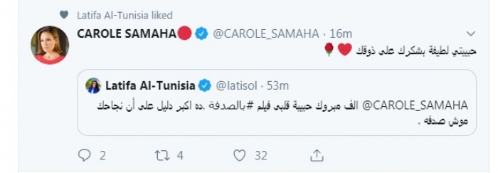 وكتبت لطيفة، عبر حسابها على تويتر، قائلة: "ألف مبروك حبيبة قلبى فيلم بالصدفة، ده أكبر دليل على أن نجاحك مش صدفة"، ومن جانبها ردت كارول سماحة على تهنئه لطيفة قائلة: "حبيبتى لطيفة بشكرك على ذوقك".