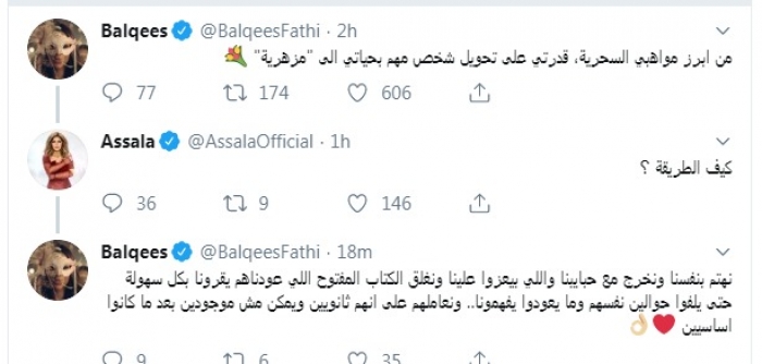 كشفت النجمة اليمنية بلقيس فتحي عن موهبتها السحرية، حيث غردت بلقيس عن بعض مواهبها عبر حسابها بتويتر قائلة: "من أبرز مواهبي السحرية، قدرتى على تحويل شخص مهم بحياتي إلى "مزهرية"، لتدخل النجمة السورية أصالة تسأل عن الطريقة قائلة: كيف الطريقة؟
