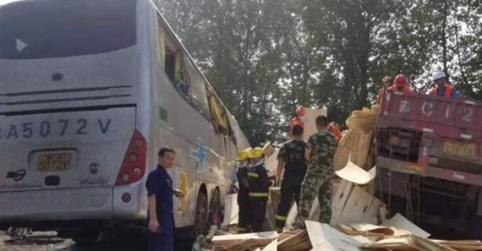 وقالت وكالة شينخوا إن الحافلة كانت تقل 69 شخصًا حينا اصطدمت بالشّاحنة على طريق سريع في إقليم جيانغسو بشرق البلاد أمس السبت.