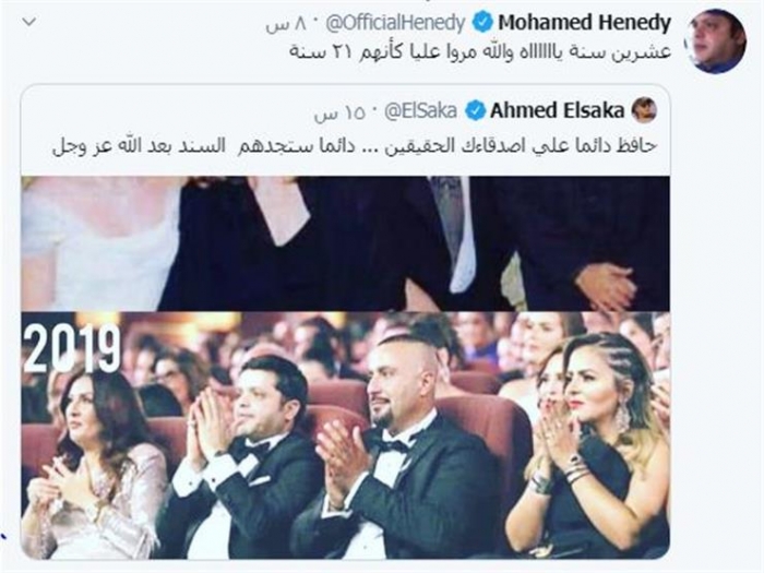 وغرد السقا: "حافظ دائما على أصدقائك الحقيقيين، دائما ستجدهم السند بعد الله عز وجل"، ليرد "هنيدي": "عشرين سنة، ياه والله مروا عليا كأنهم 21 سنة".