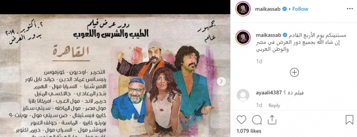 روجت الفنانة مي كساب، عبر حسابها بموقع إنستجرام، لفيلمها الجديد "الطيب والشرس واللعوب"، المقرر طرحه بالسينمات غدا الأربعاء الموافق 2 أكتوبر.