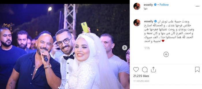 ونشر العسيلي منذ قليل بعض صور حفل الزفاف عبر صفحته الرسمية بموقع "انستجرام"، وكتب :"و عدت حبيبة على تويتر ان خلاص فرحها عندي .. و الحمدلله امبارح وفيت بوعدي و روحت غنيتلها ففرحها هي و أحمد.. الفرح كان في بنها و كان تحفة و الحمد لله هما انبسطوا جدا .. الف مبروك لحبيبة وأحمد".