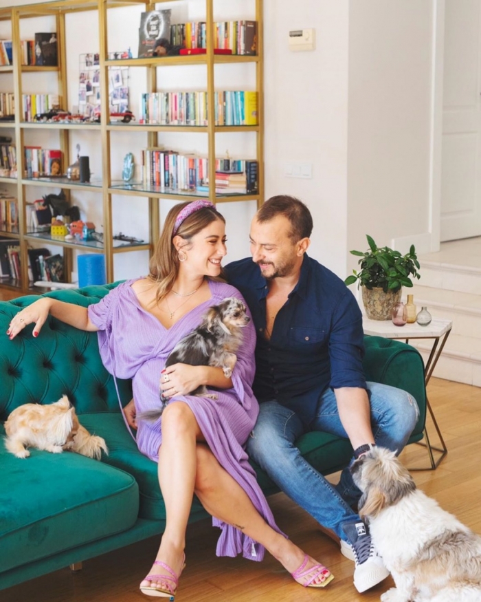وظهرت هازل في الصور، وهي ترتدي فستانا باللون البنفسجي الفاتح، وتمسك ببطنها، وظهرت في صورة مع زوجها المخرج والممثل التركي علي آتاي، وكلب، وقطة.